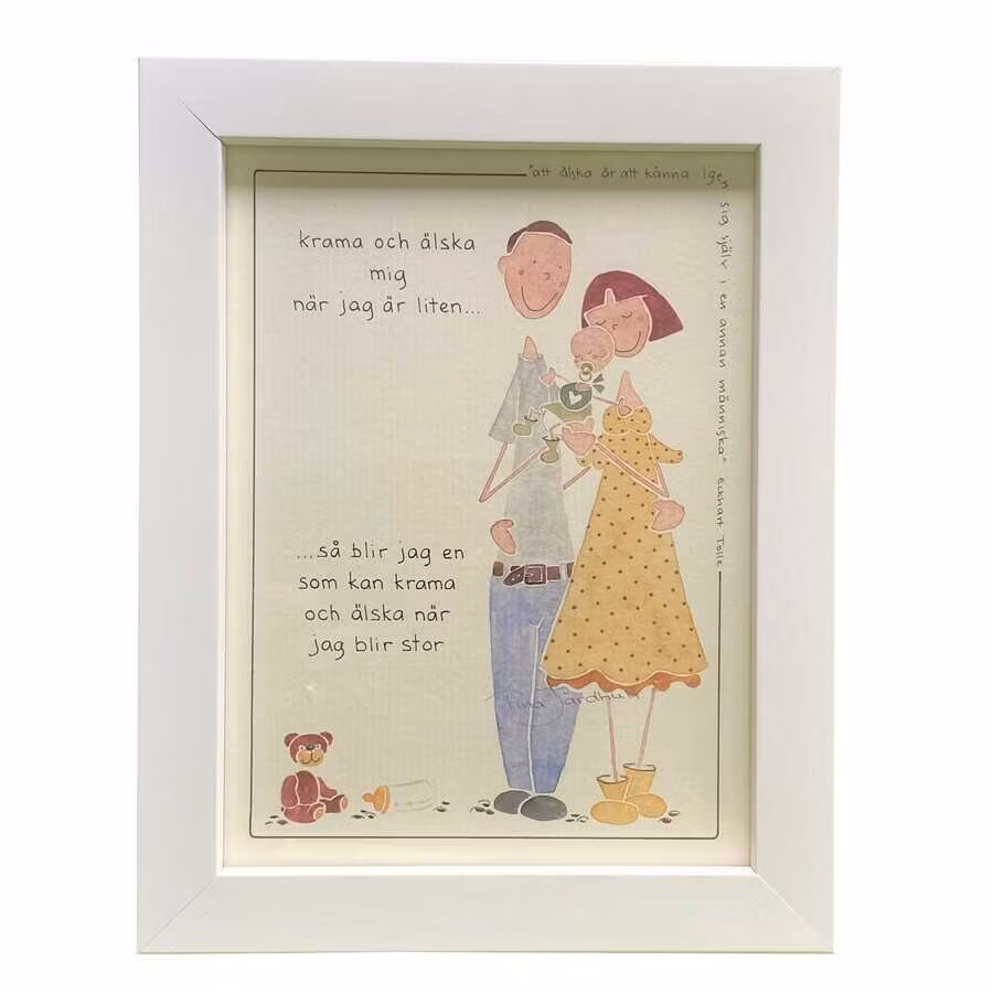 Tavla med texten: Krama och älska mig när jag är liten så blir jag en som kan krama och älska när jag blir stor.