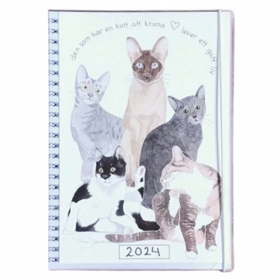 En riktigt fin skrivkalender för 2024 i formatet A5 för den som älskar katter! Bild och text på framsidan är skapad av illustratören Tina Järdhult och lyder ”den som har en katt att krama lever ett gott liv”.
