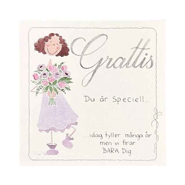 Fint dubbelkort med kuvert. Bild på framsidan och med texten Grattis Du är speciell…idag fyller många år men vi firar BARA Dig. På uppslaget inuti finns det gott om plats att skriva sin egen hälsning eftersom det på insidan inte är någon förtryckt text. Kortet är tryckt från originalmålning av konstnär och illustratör Tina Järdhult.