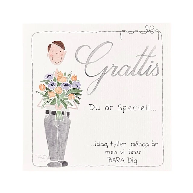 Fint dubbelkort med kuvert. Bild på framsidan och med texten Grattis Du är speciell…idag fyller många år men vi firar BARA Dig. På uppslaget inuti finns det gott om plats att skriva sin egen hälsning eftersom det på insidan inte är någon förtryckt text. Kortet är tryckt från originalmålning av konstnär och illustratör Tina Järdhult.