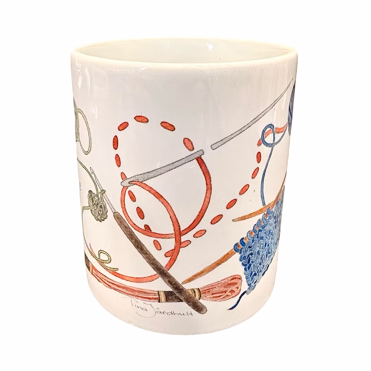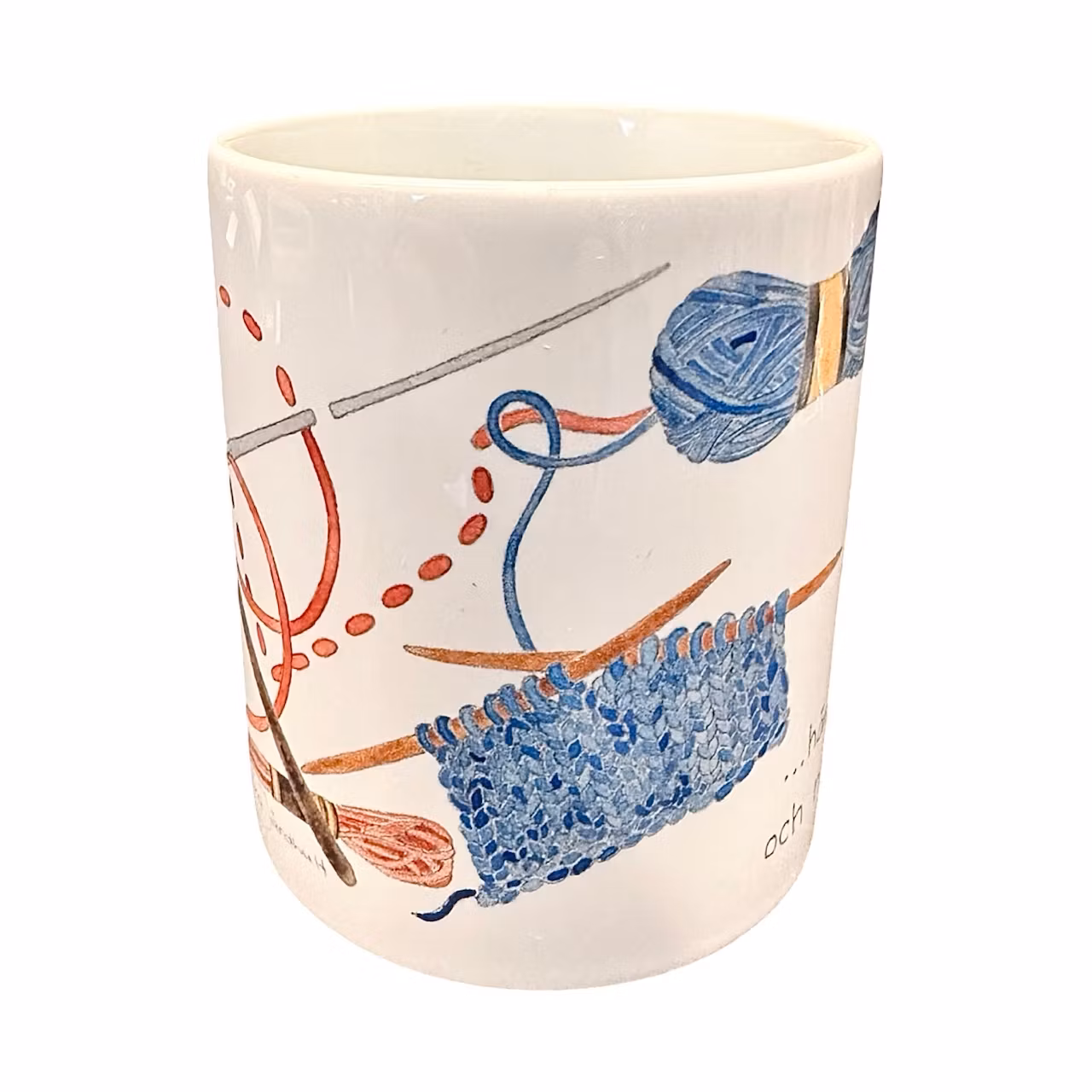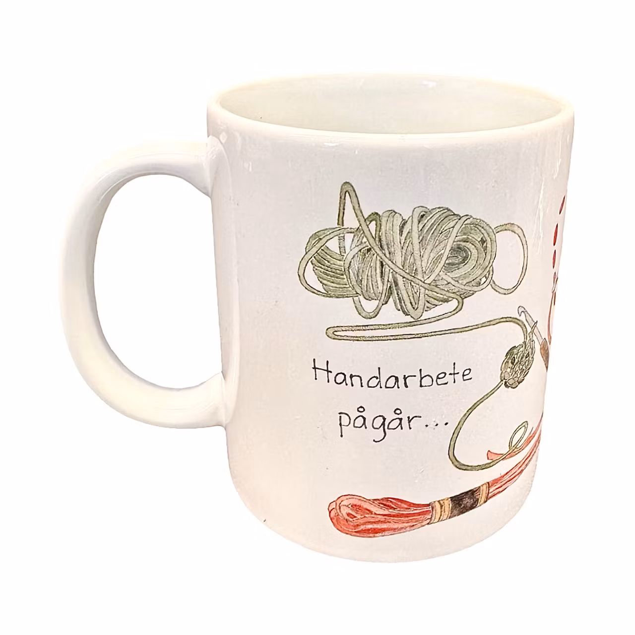 Här har du den perfekta muggen till den som gillar att handarbeta. Fin mugg med texten; ”Handarbete pågår…här och nu!”. Bilden är tryckt från originalmålning av konstnär och illustratör Tina Järdhult och den fina bilden sträcker sig runt hela muggen.