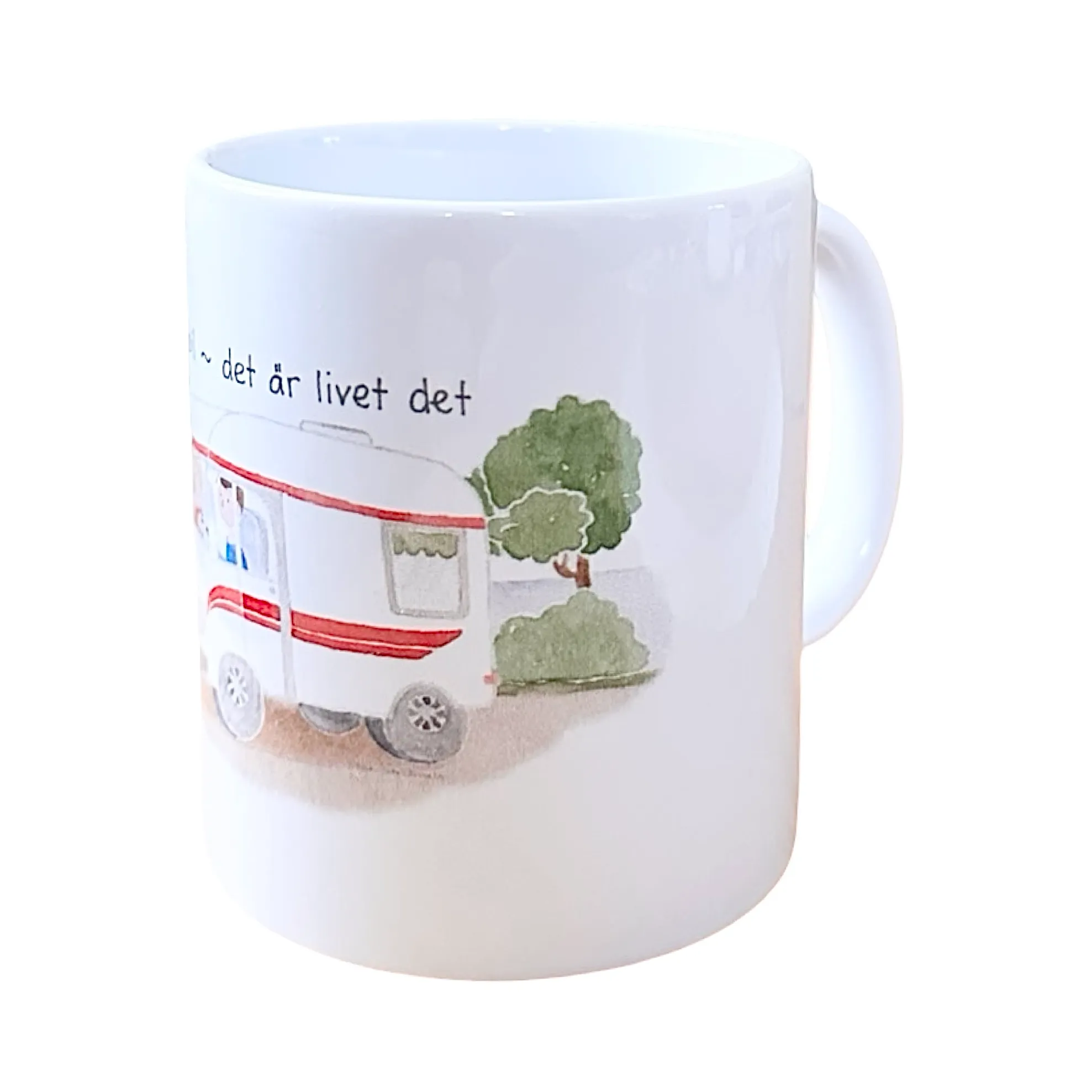 Här har du den perfekta muggen för husbilsägaren med texten; ”husbil – det är livet det!”. Bilden är tryckt från originalmålning avTina Järdhult och den fina bilden sträcker sig runt hela muggen. En riktigt fin och rejäl porslinsmugg som passar såväl på campingen som hemma. Kommer i en vit presentkartong. Finns även som frukostbricka i samma tema och som paketpris med en bricka och en mugg.